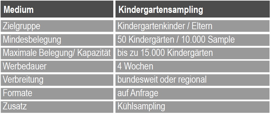 Samplings an Eltern können über eine Hand-zu-Hand-Verteilung in Kindergärten vorgenommen werden. Zur Elternansprache von Kindern im Kindergärten bieten wir verschiedene Medien an